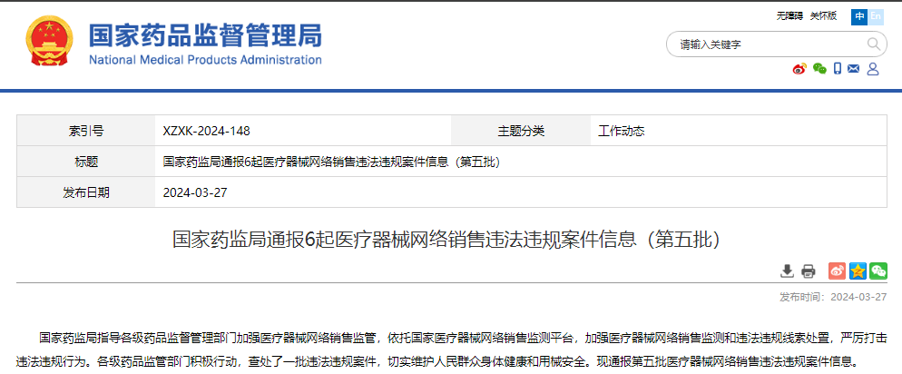 國(guó)家藥監(jiān)局通報(bào)6起醫(yī)療器械網(wǎng)絡(luò)銷售違法違規(guī)案件信息(第五批)